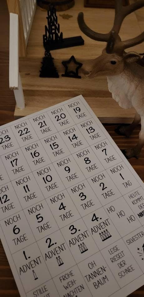 - Lieferumfang: Standfuß + 3 Einsätze + 1 A6-Kartenbogen (36 Kärtchen mit Countdown & Weihnachtssprüchen)