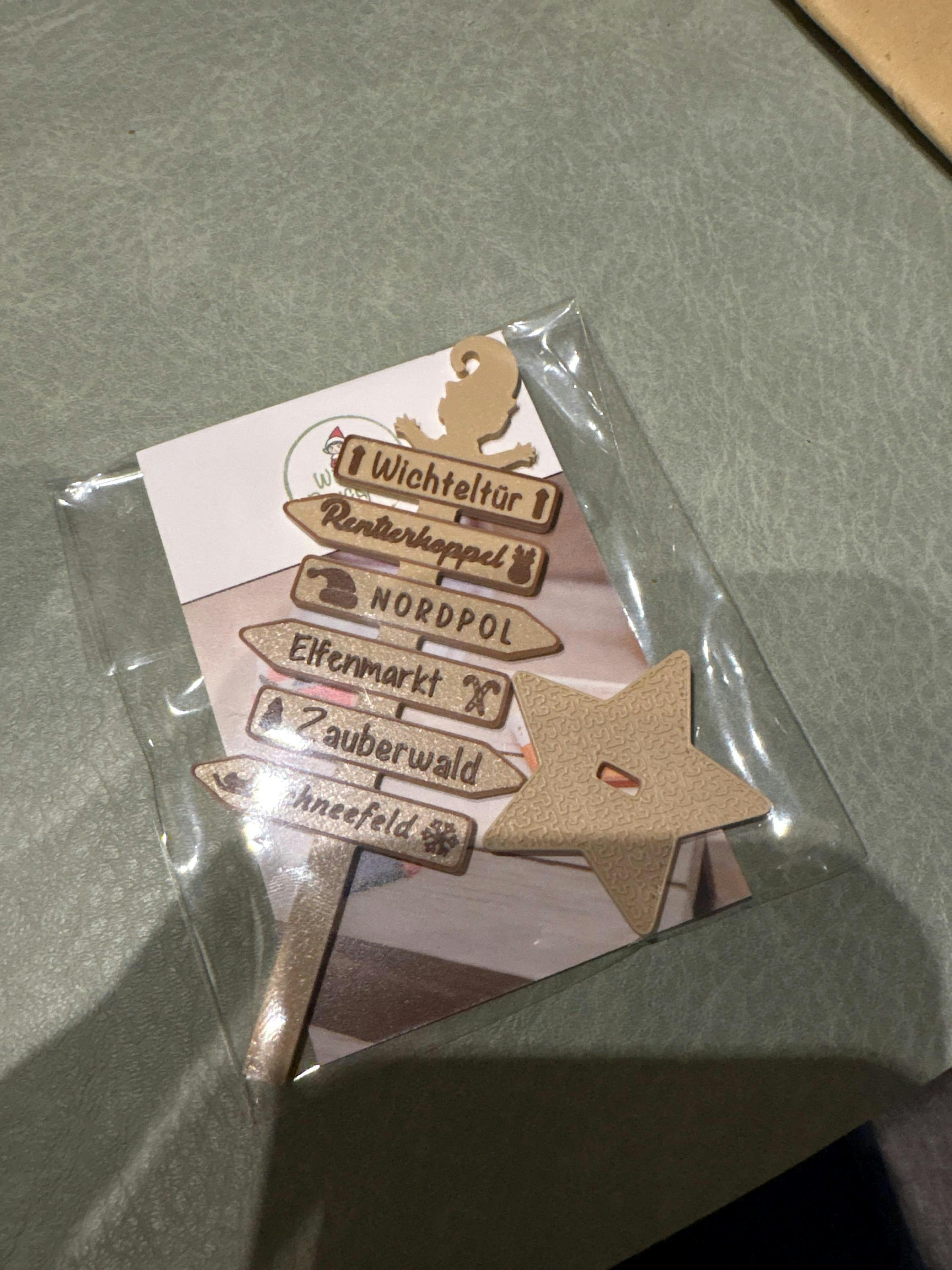 Jeder Ort ist mit einem süßen kleinen Piktogramm versehen, das für Kinder wie Erwachsene sofort erkennbar ist. Der Wegweiser selbst ist 3D-gedruckt aus hochwertigem PLA (biologisch abbaubar) und steckt in einem abnehmbaren Standfuß in Sternform – stabil, dekorativ und einfach zauberhaft.